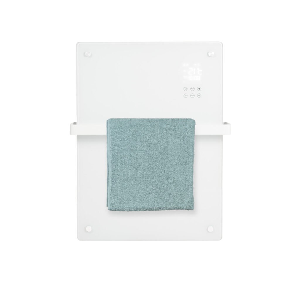 El Eurom Alutherm Sani Verre 800 Wifi Blanco es un calefactor de baño con frontal de cristal. Además, incluye un toallero. Esto le da un aspecto elegante y moderno, ideal para el baño.